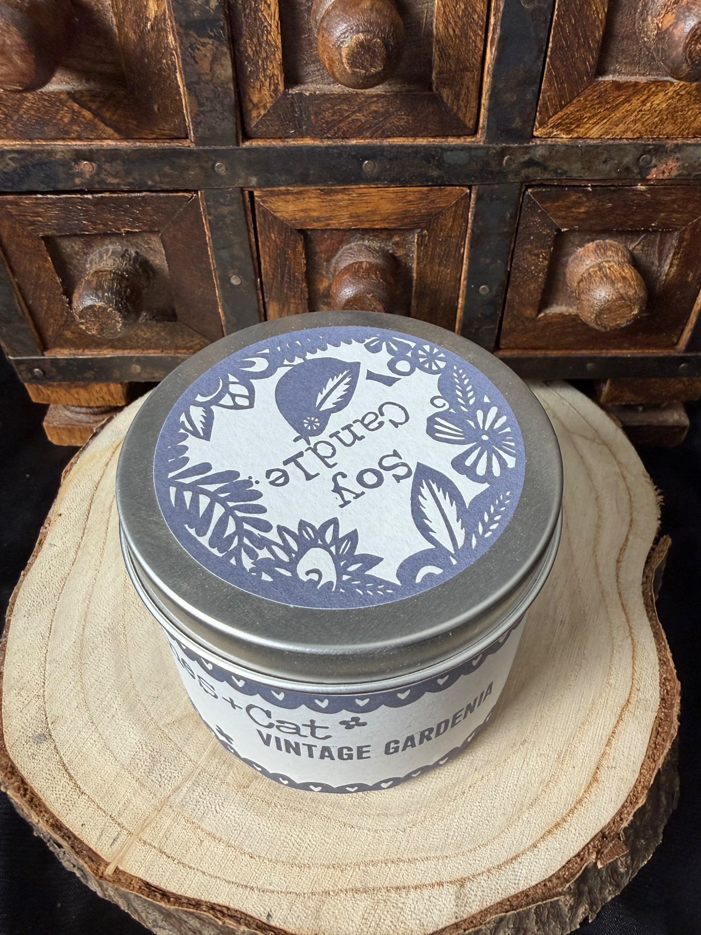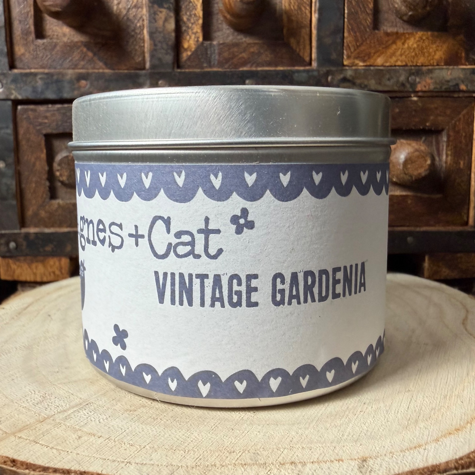 Bougie en étain Agnès and Cat Vintage Gardenia. Cette gamme de bougies en étain est fabriquée avec de la cire de soja naturelle et de magnifiques parfums élaborés avec un mélange d'huiles essentielles naturelles et d'huiles parfumées britanniques de haute qualité. Lorsque Agnes and Cat n'était qu'une boutique dans le Lake District, les bougies en étain étaient l'un des premiers produits qu'il ont lancés. Les étiquettes et les boîtes sont conçues dans leur style iconique.
