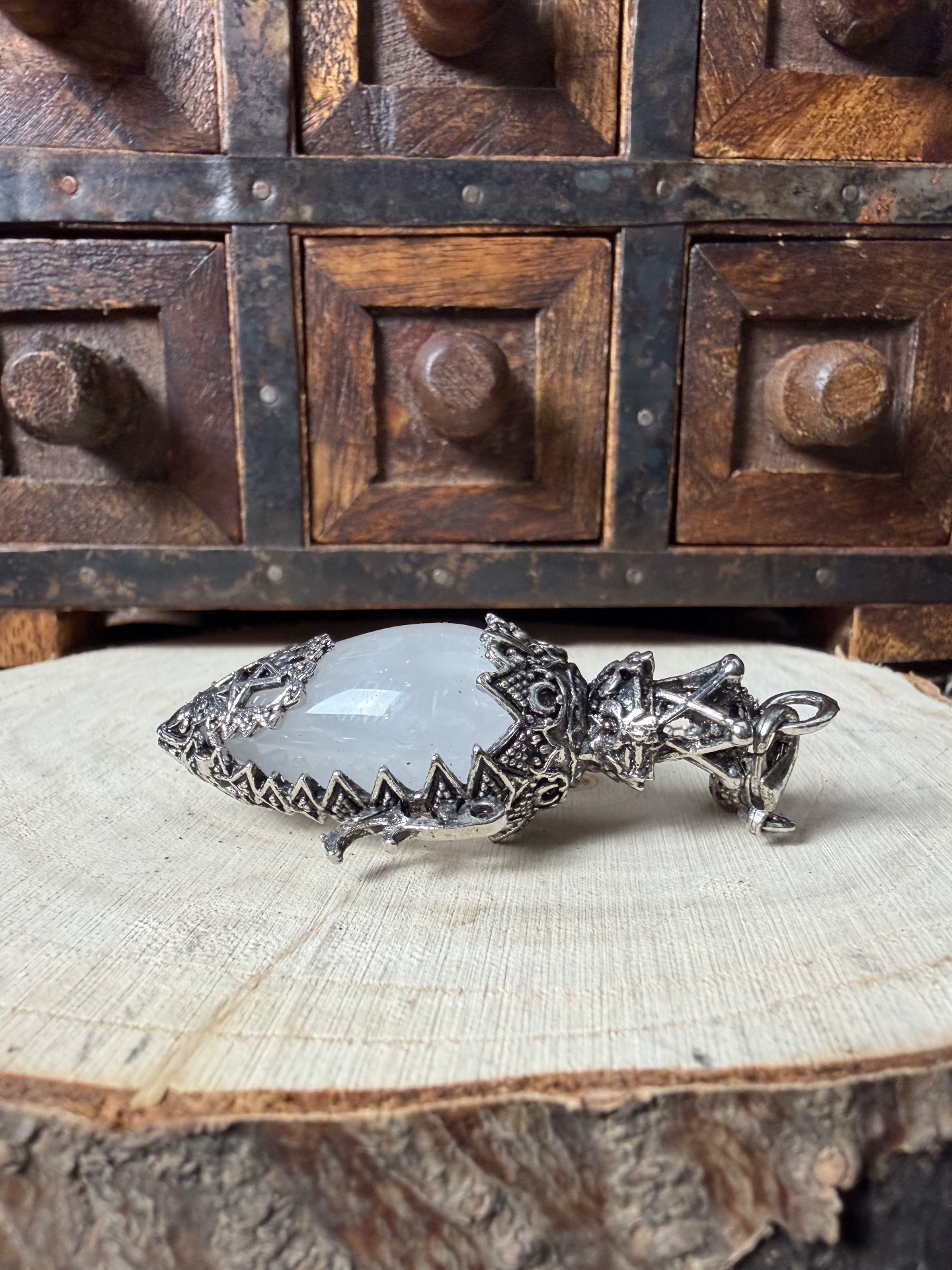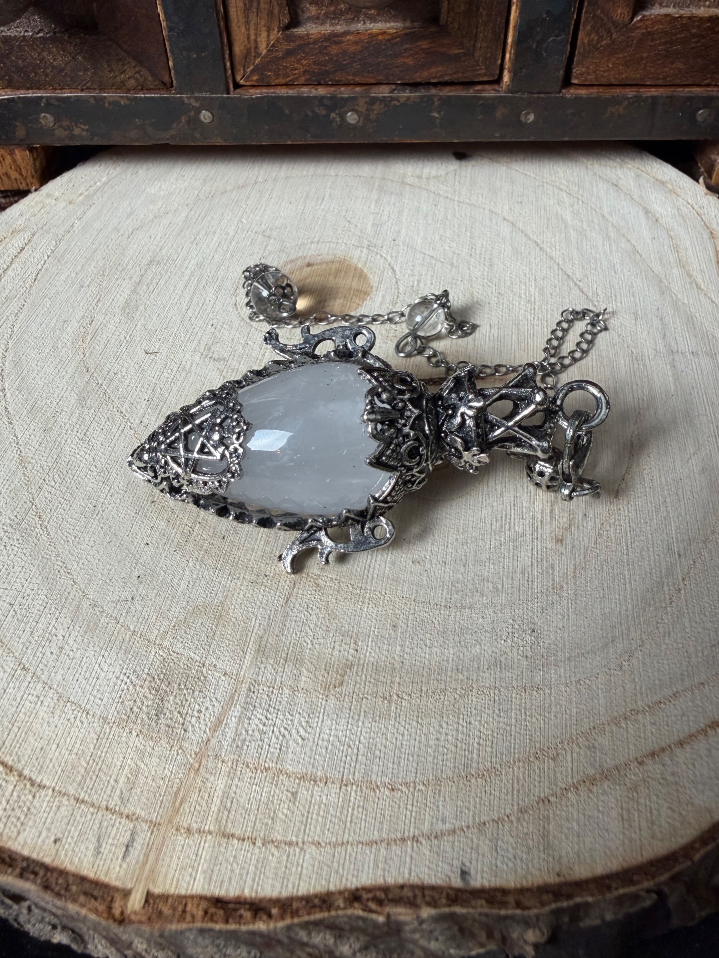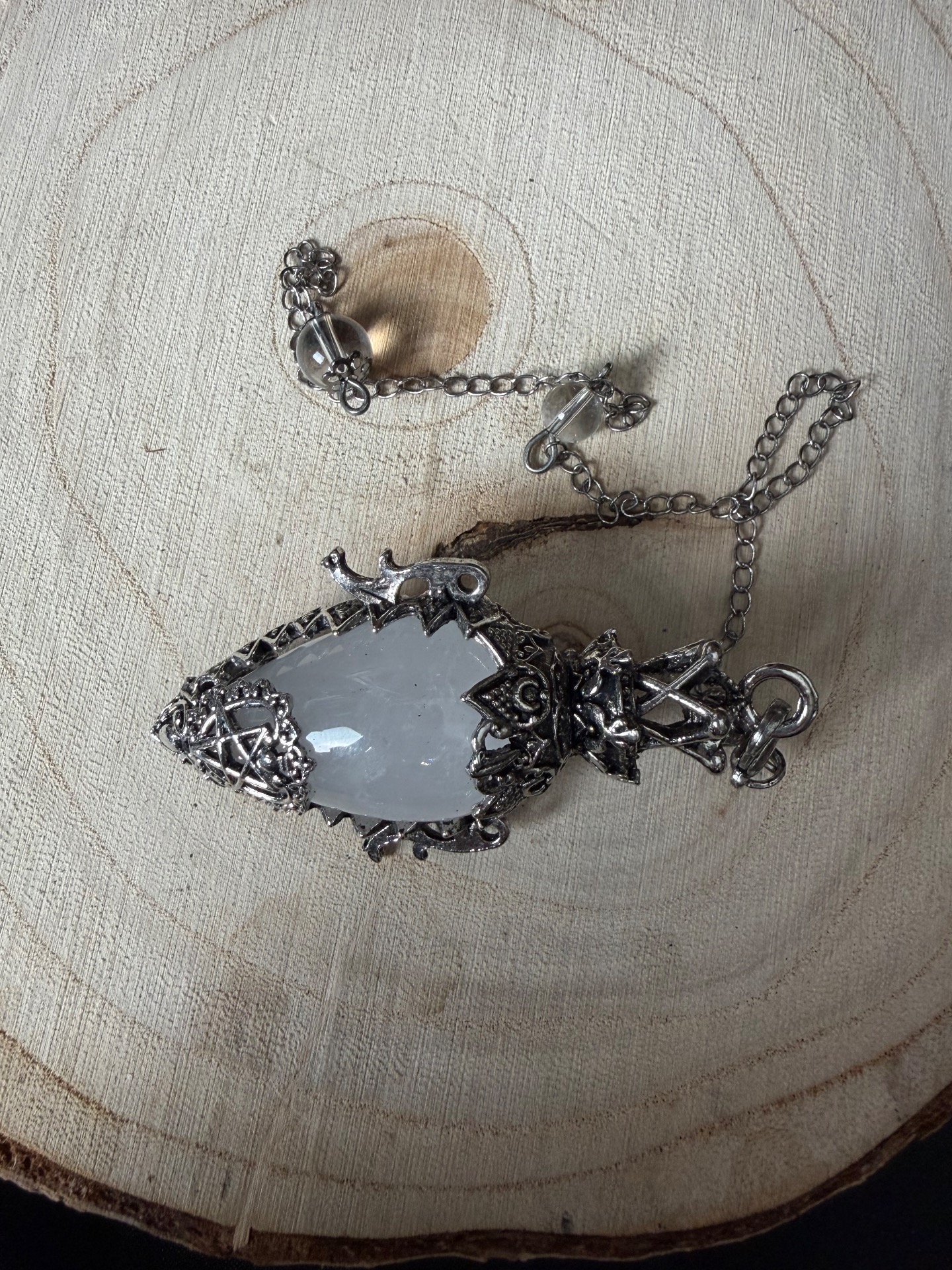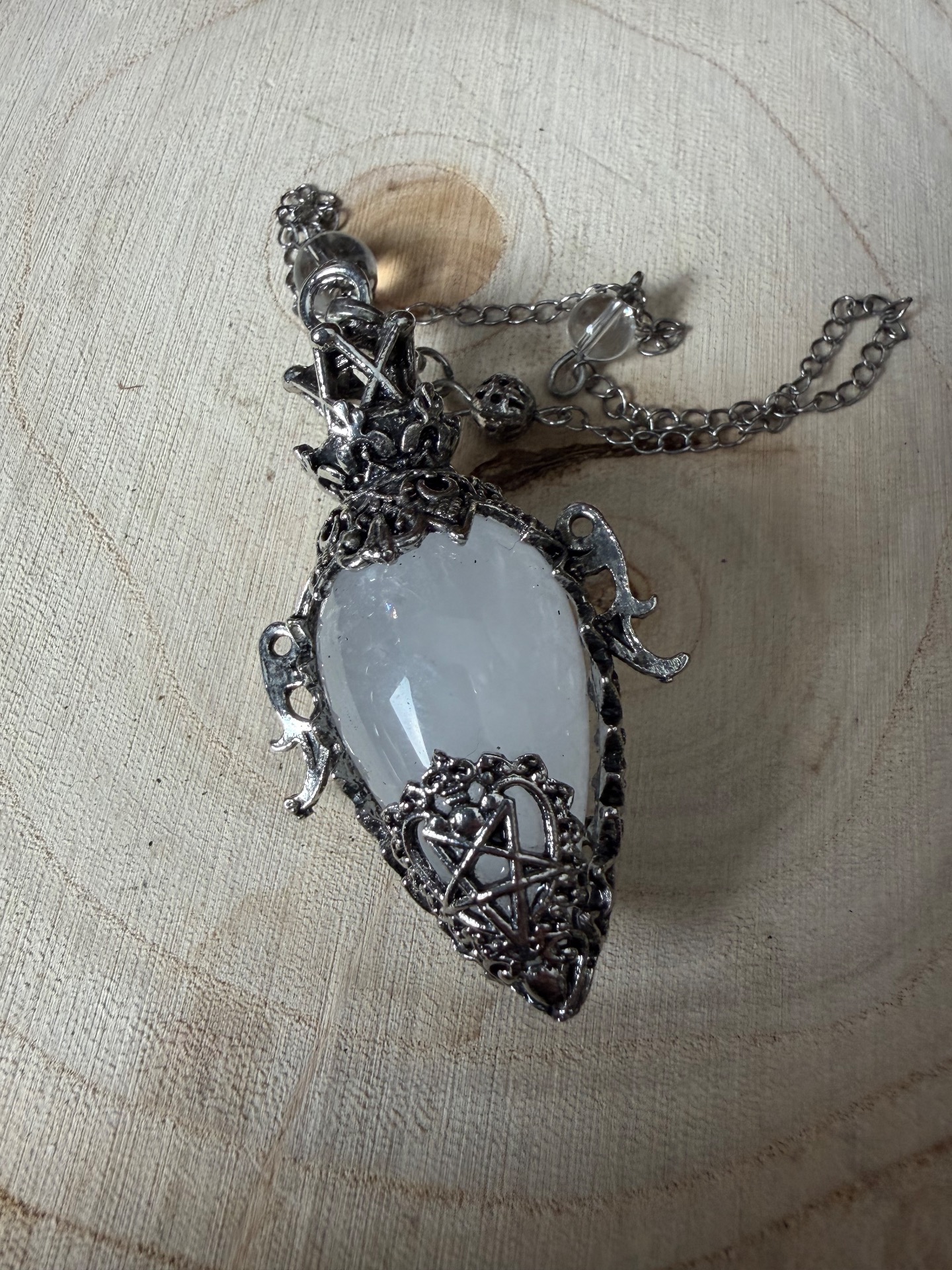 Magnifique Pendule en Cristal de Roche goutte, entouré de sa magnifique cage couleur argent.