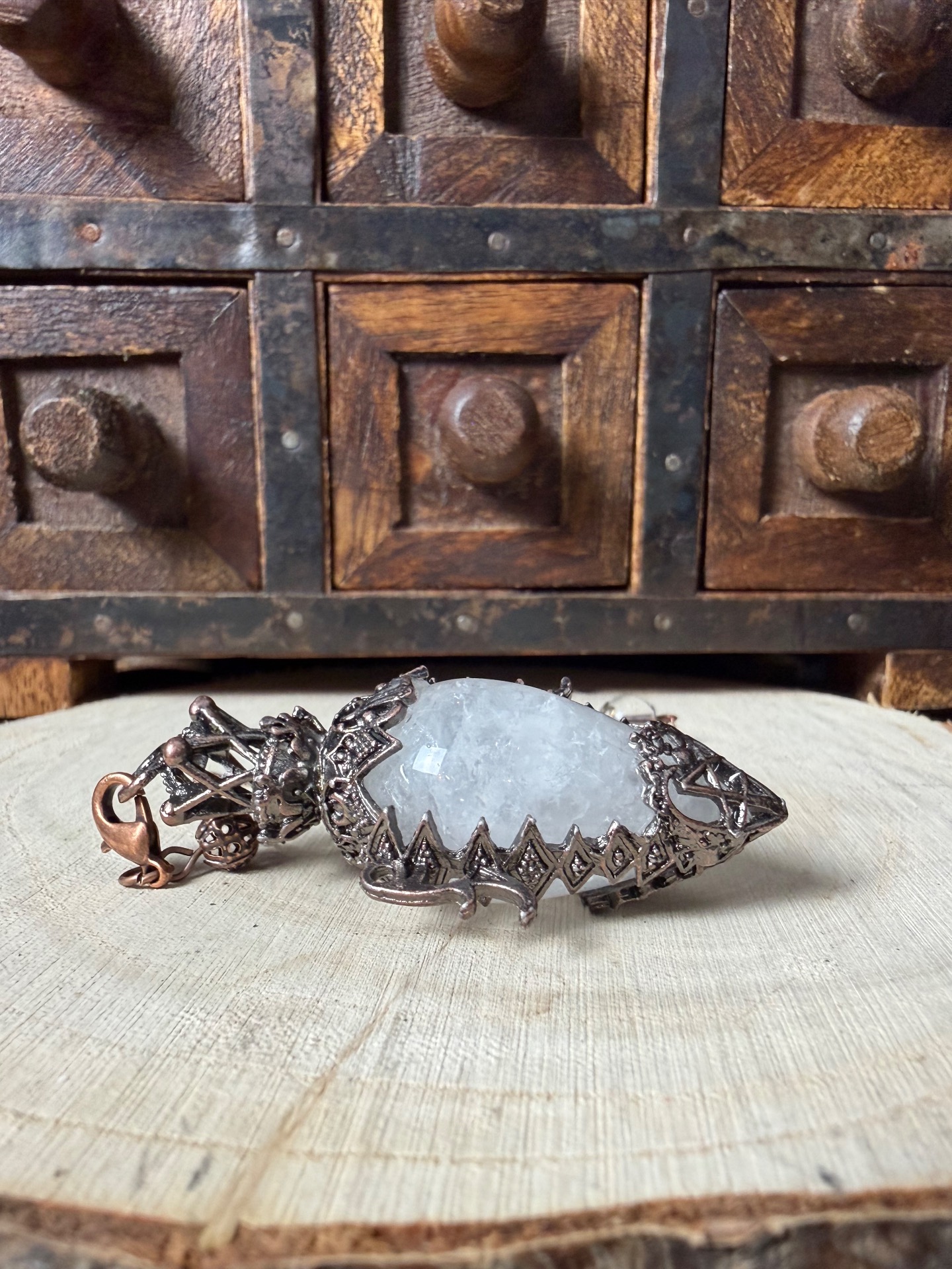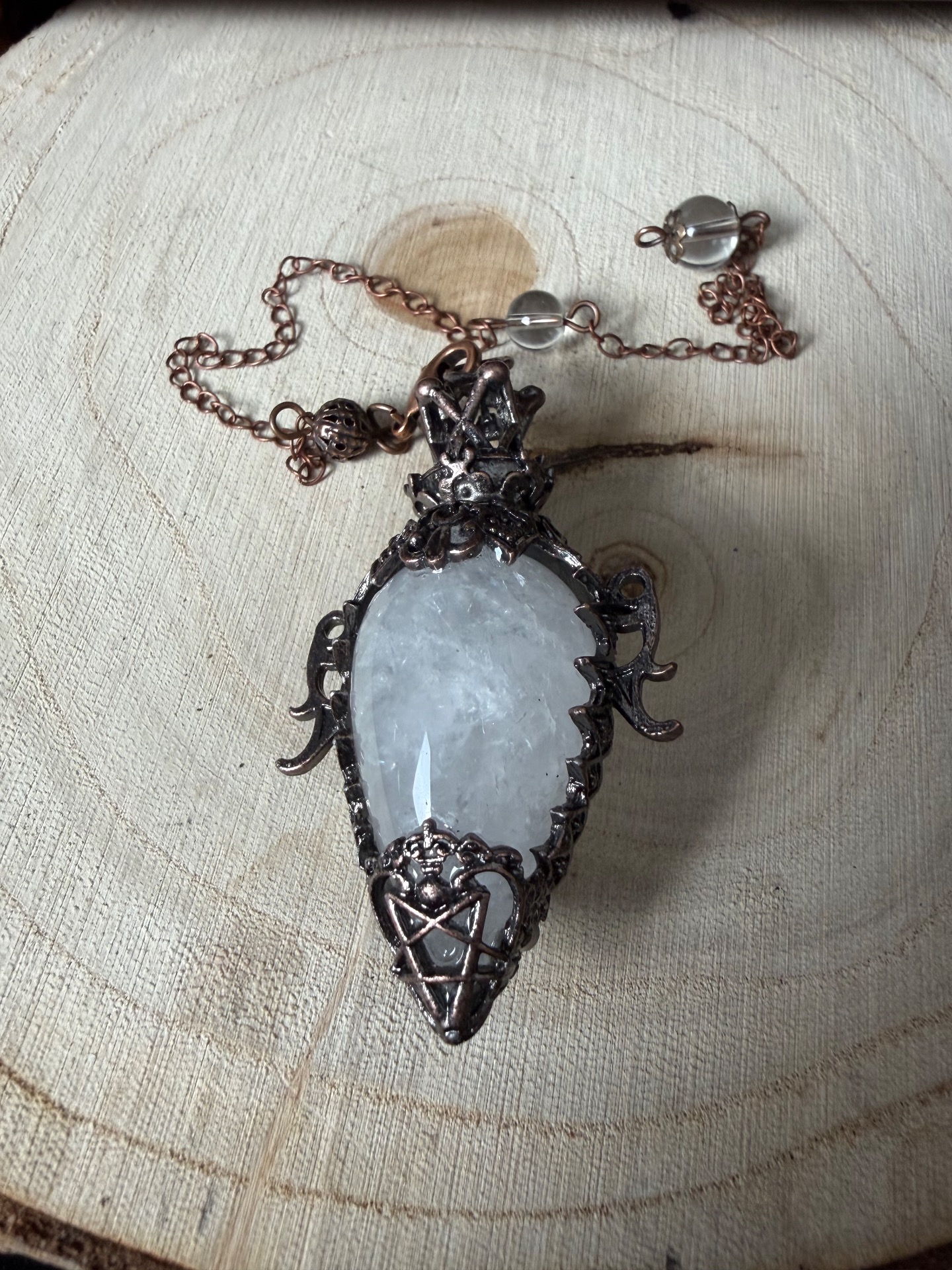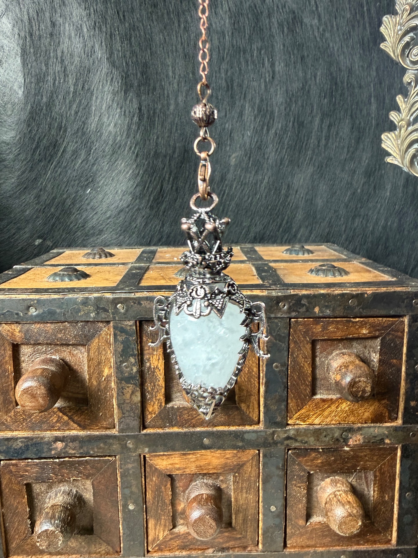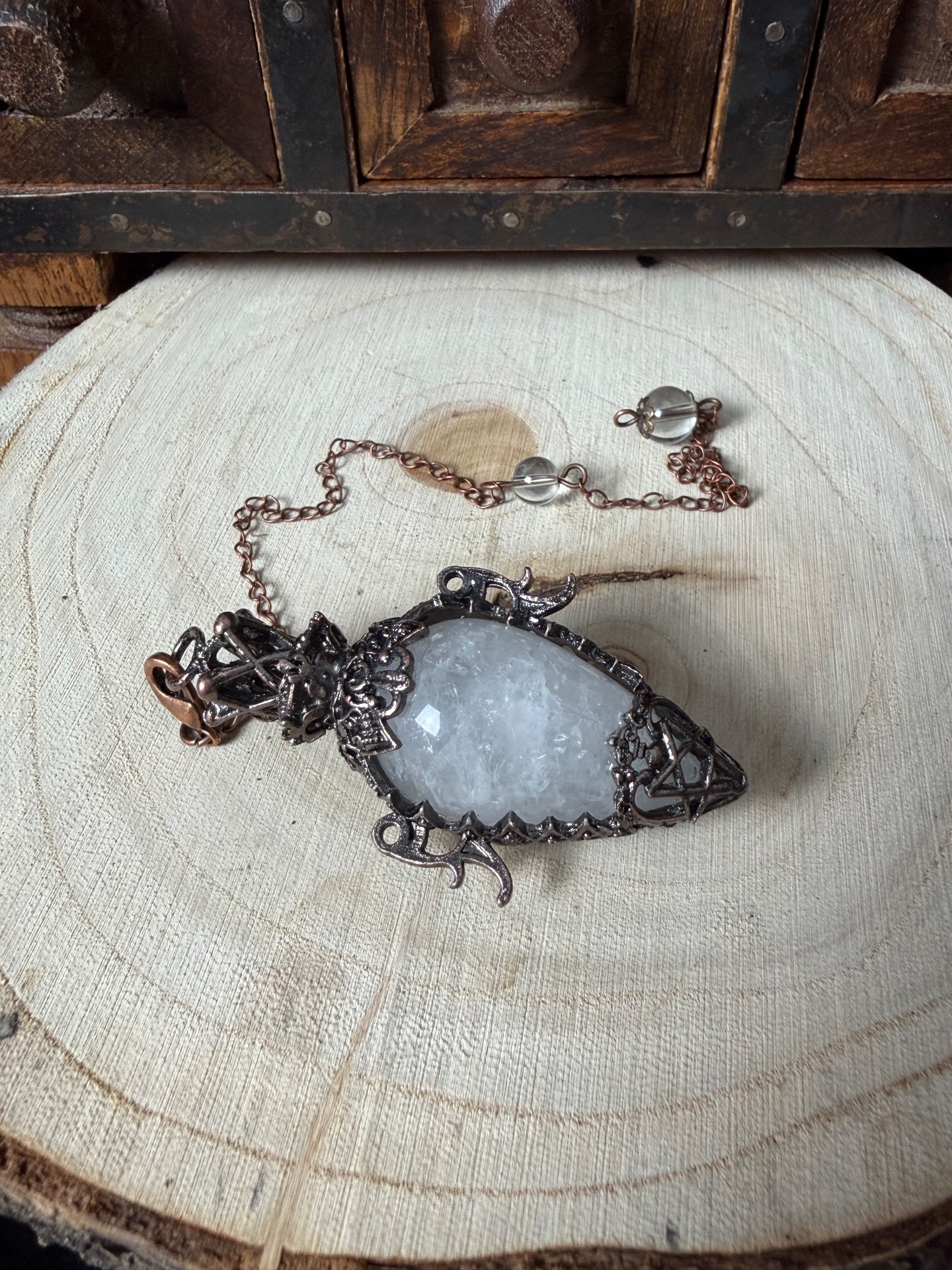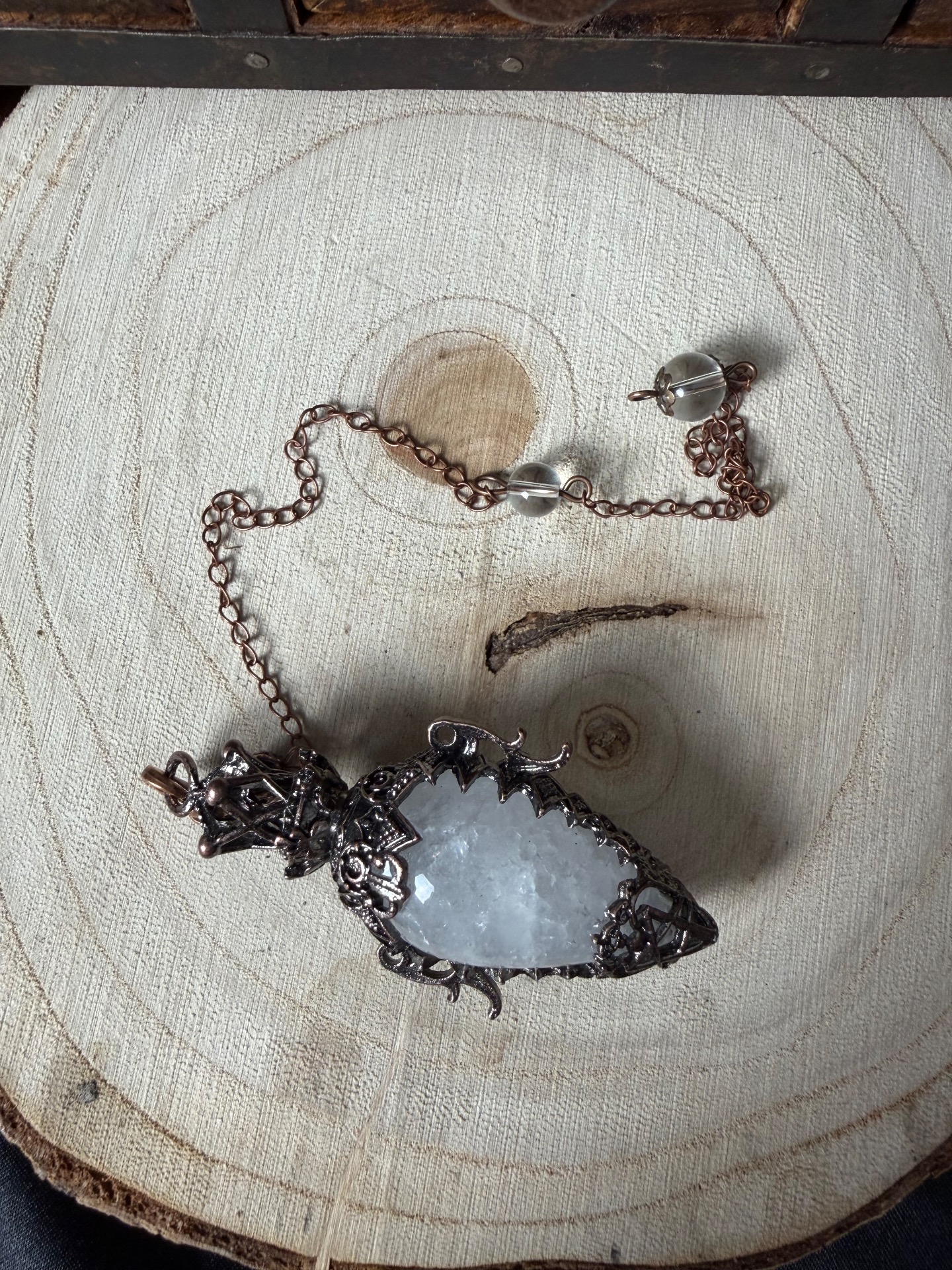 Magnifique Pendule en Cristal de Roche goutte entouré de sa magnifique cage couleur cuivre.