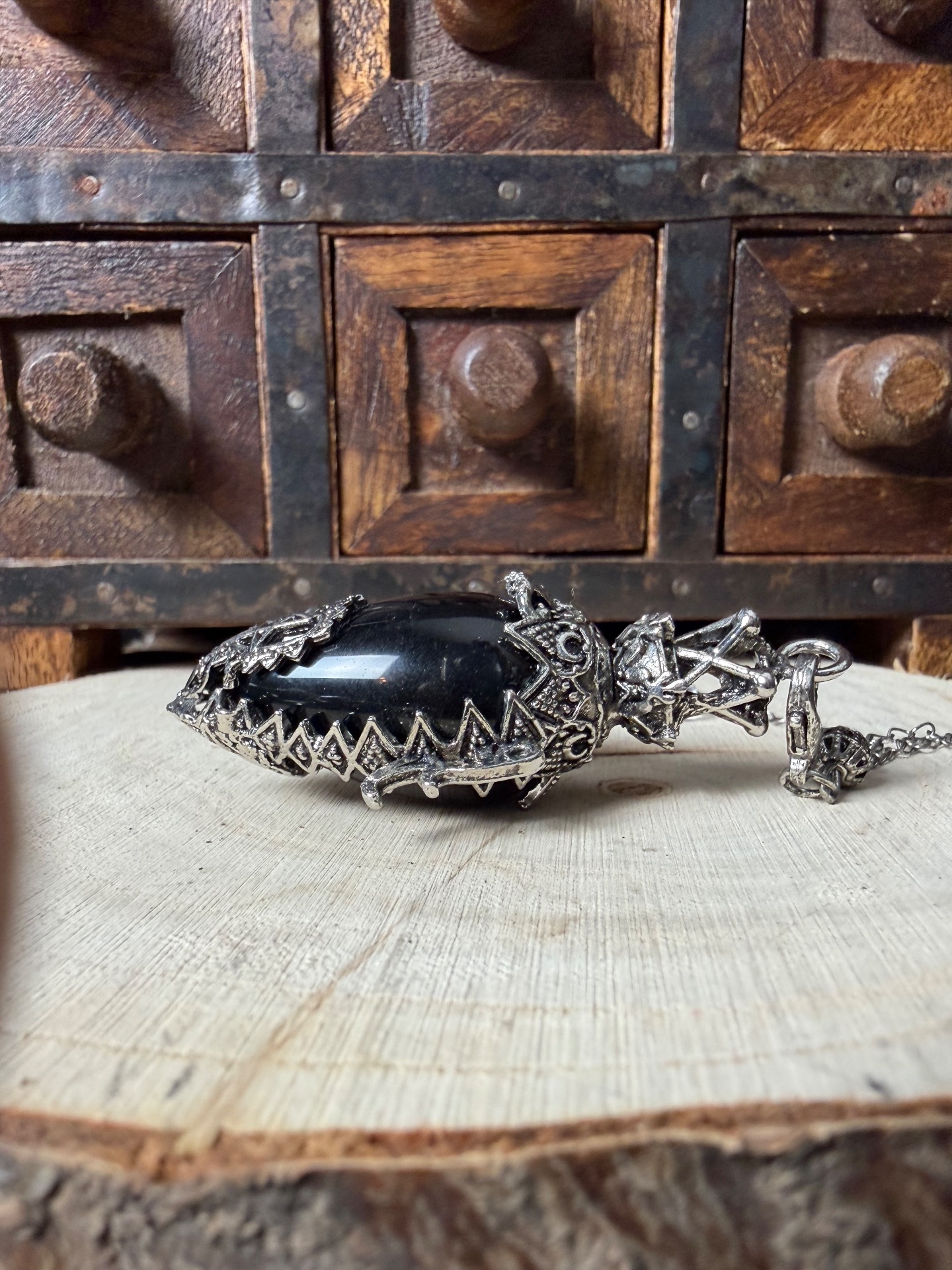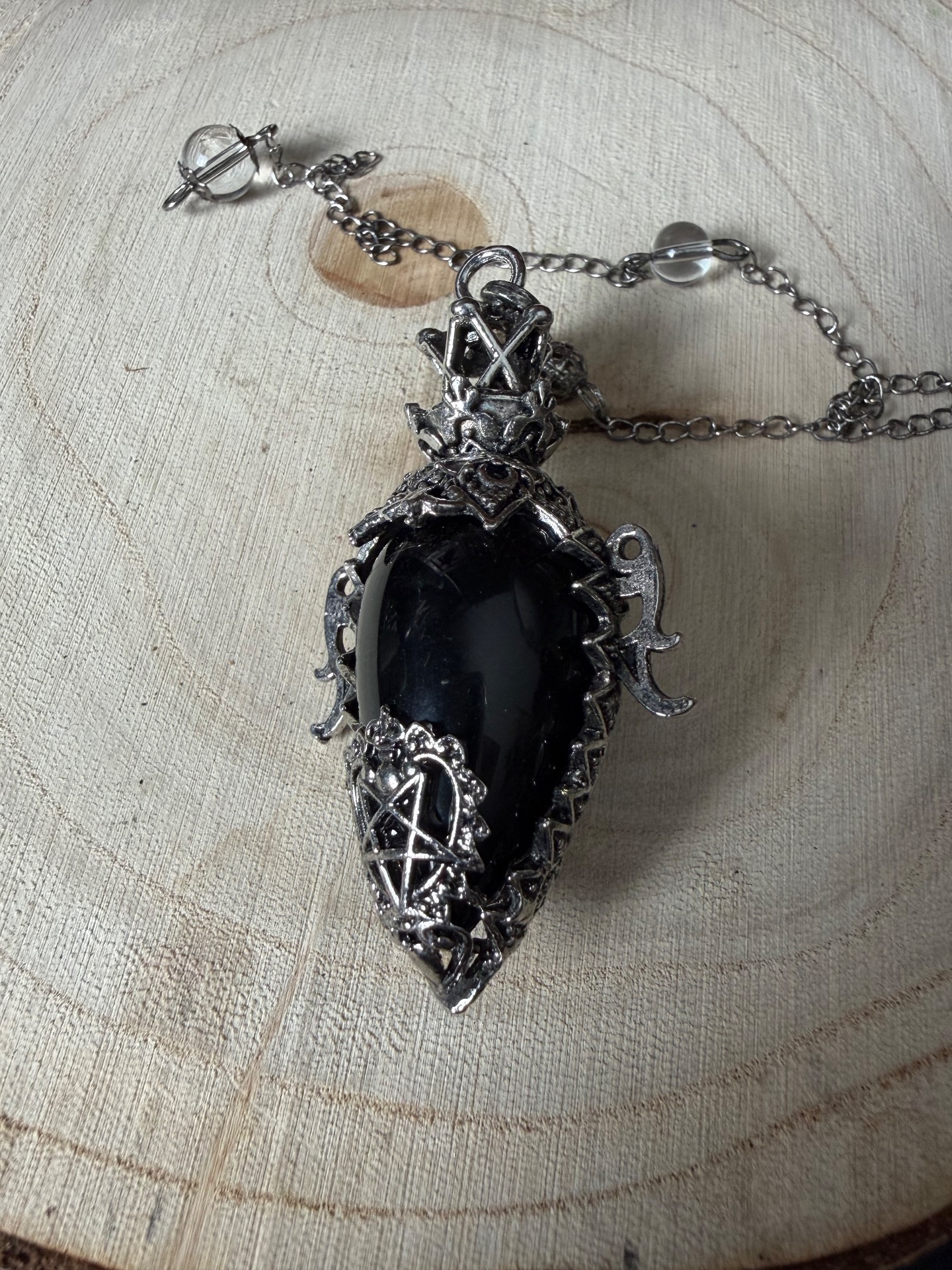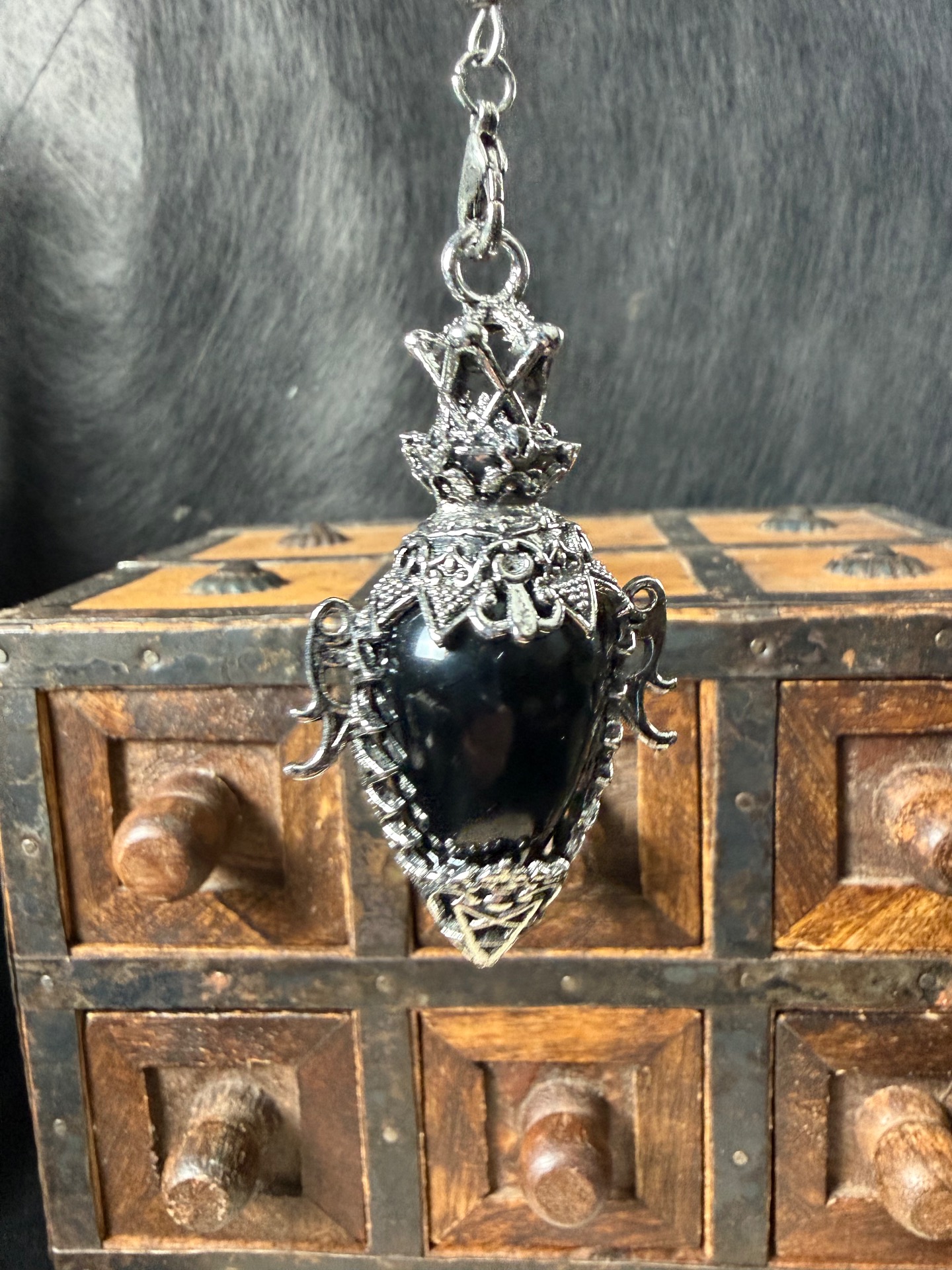 Magnifique Pendule en Obsidienne goutte entouré de sa magnifique cage couleur argent.