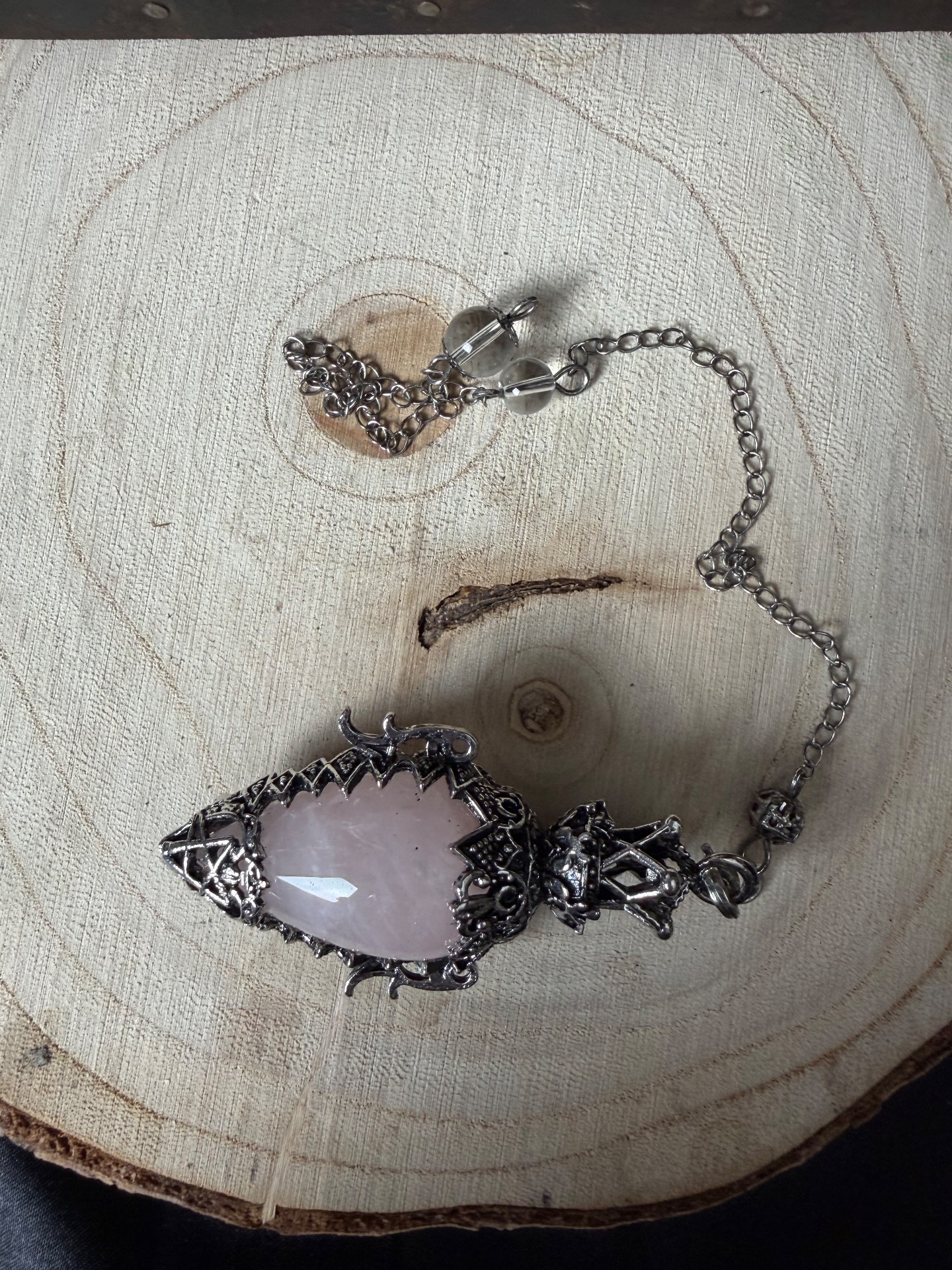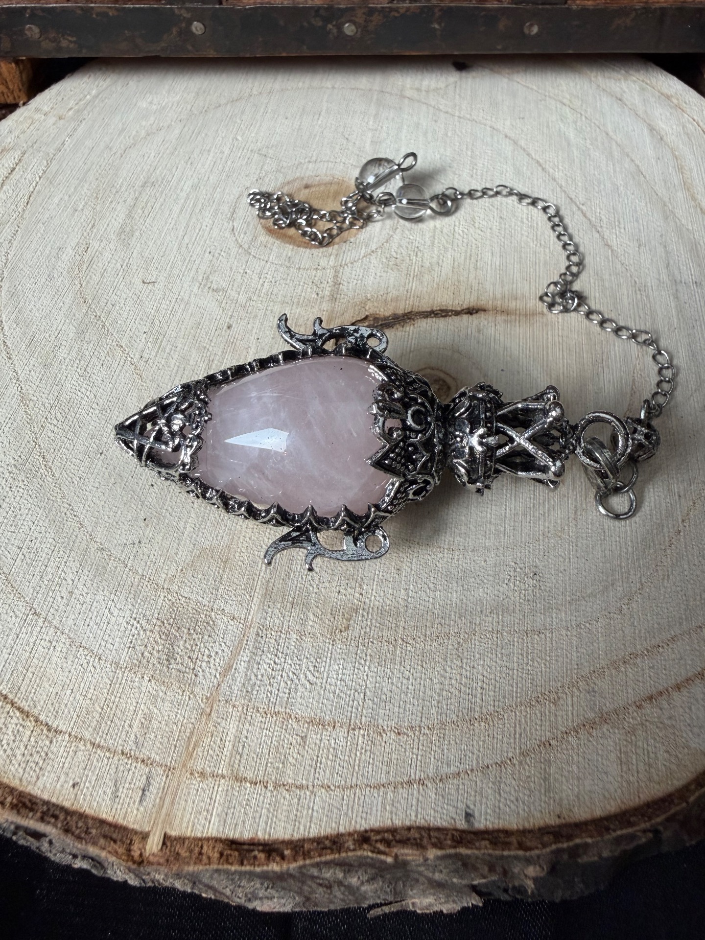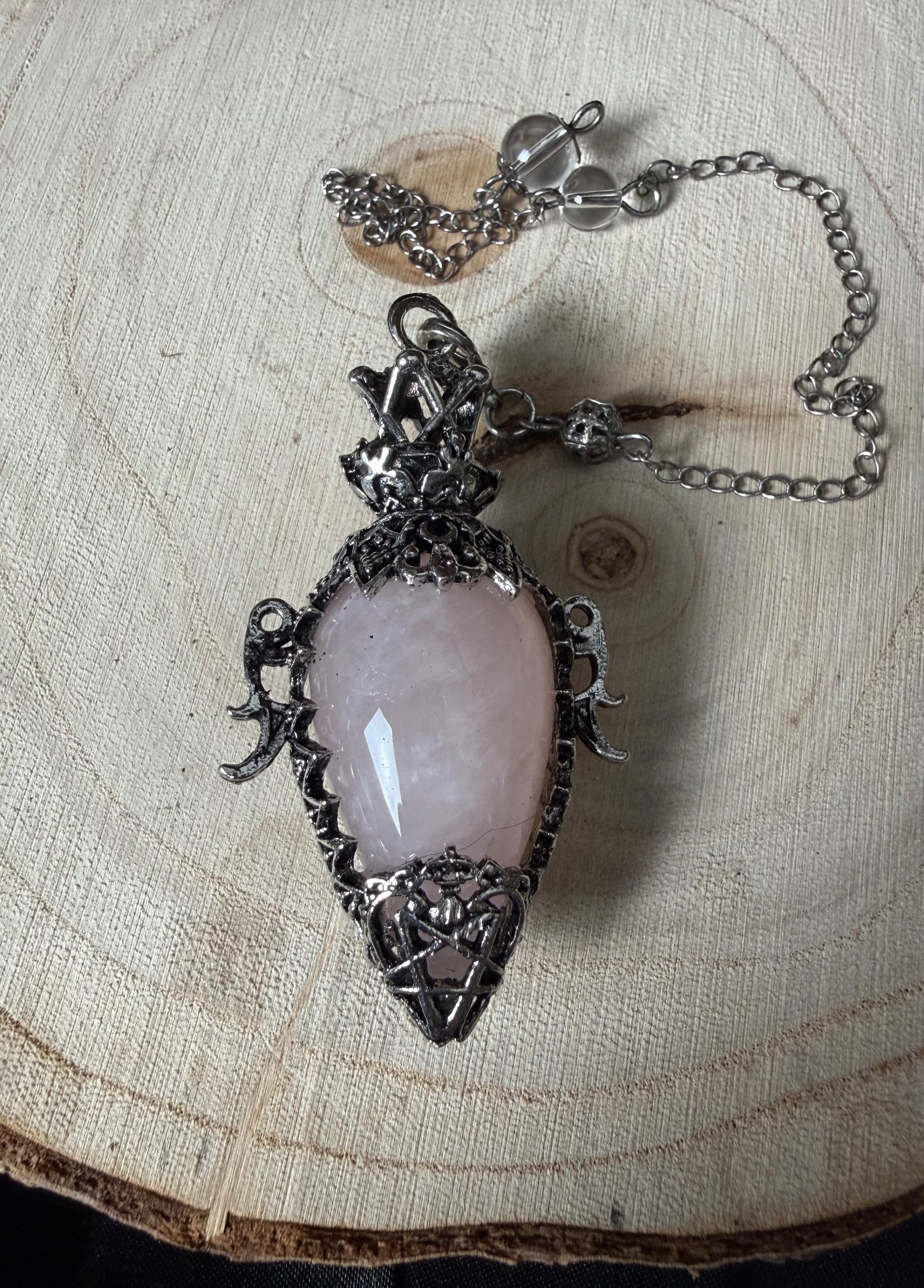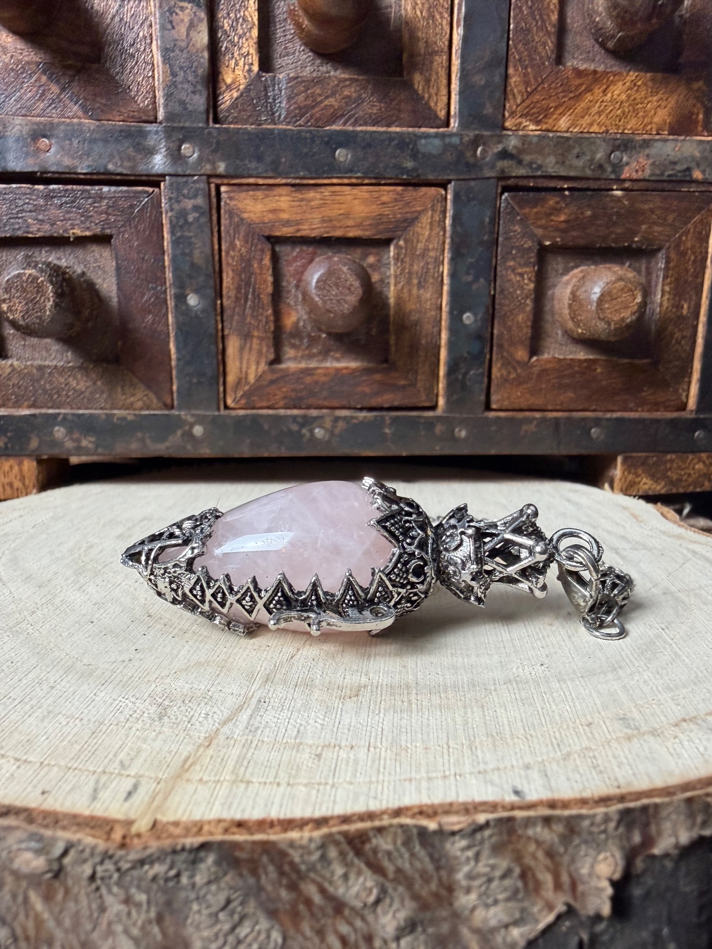 Magnifique Pendule en Quartz Rose goutte, entouré de sa magnifique cage couleur argent.