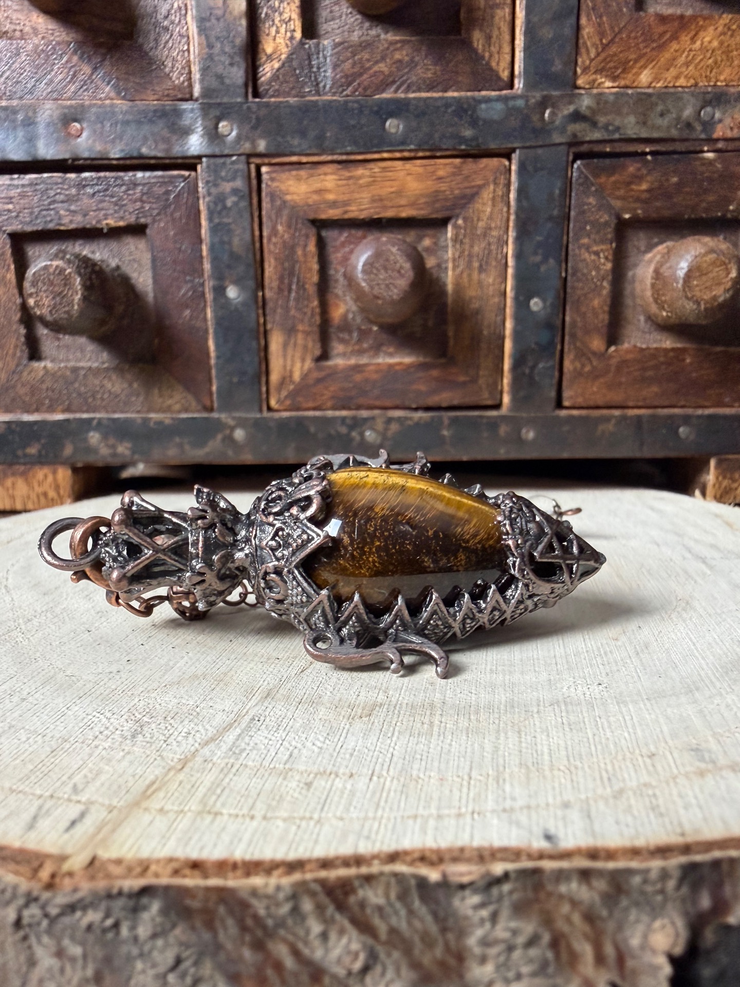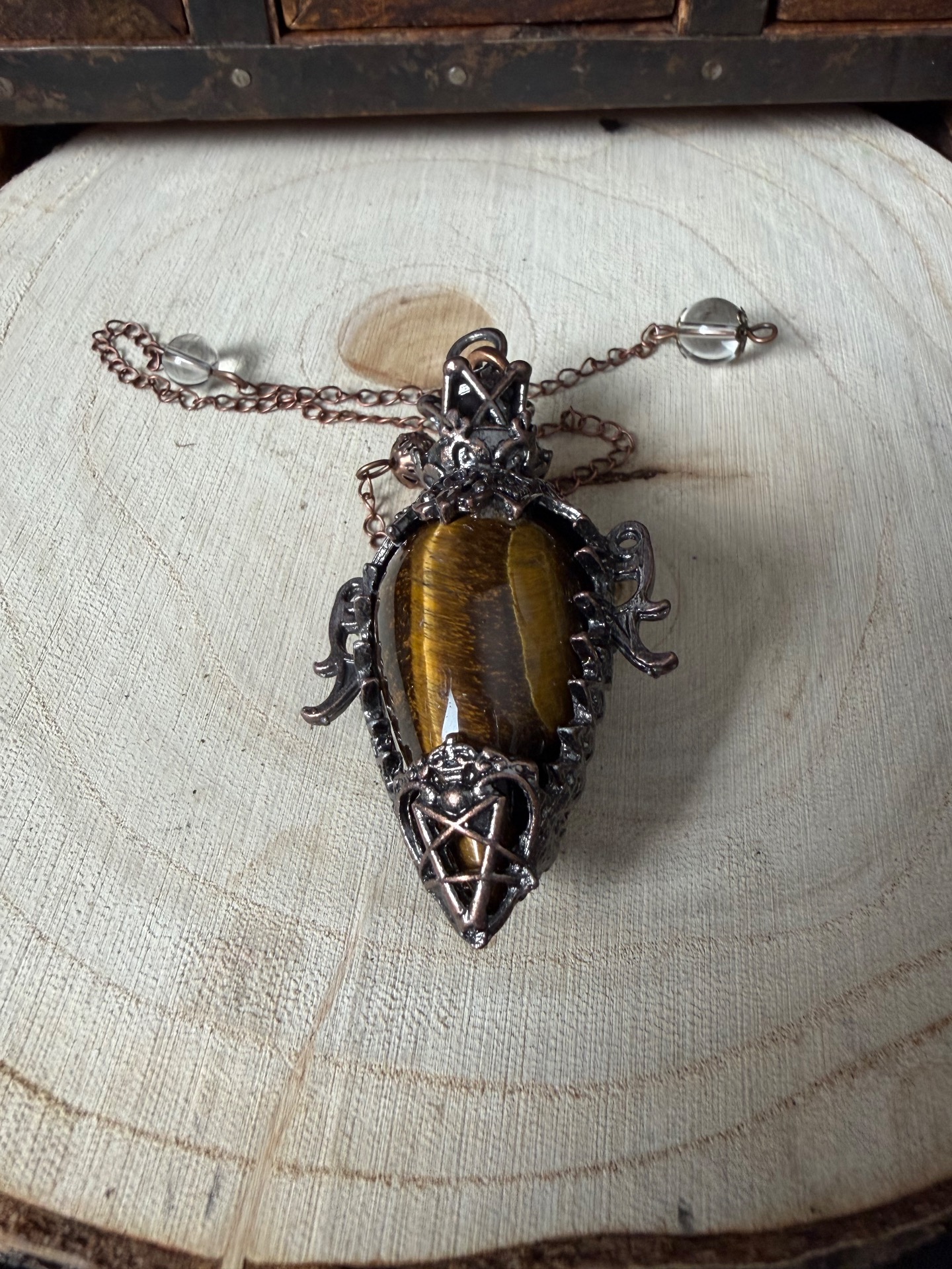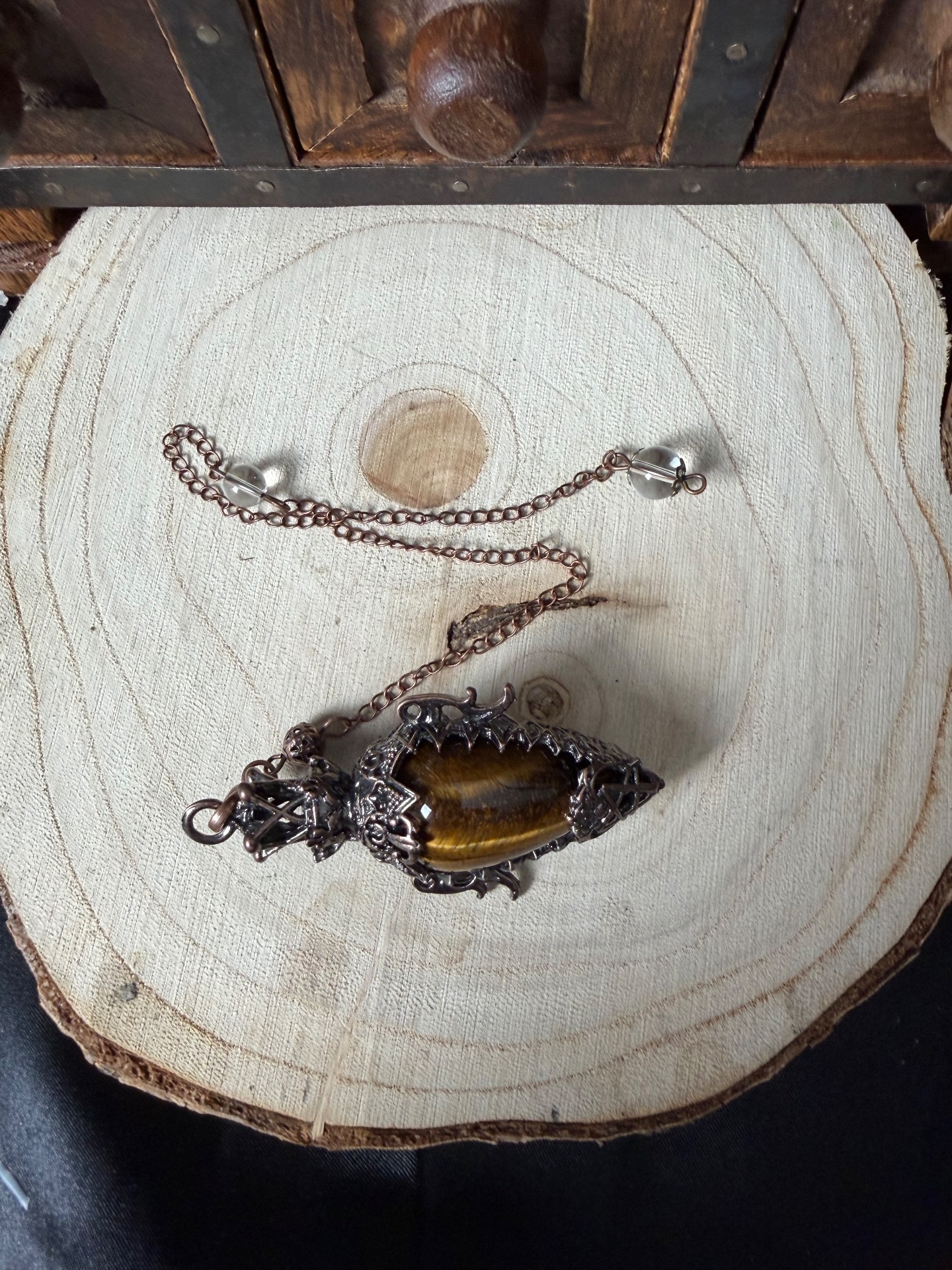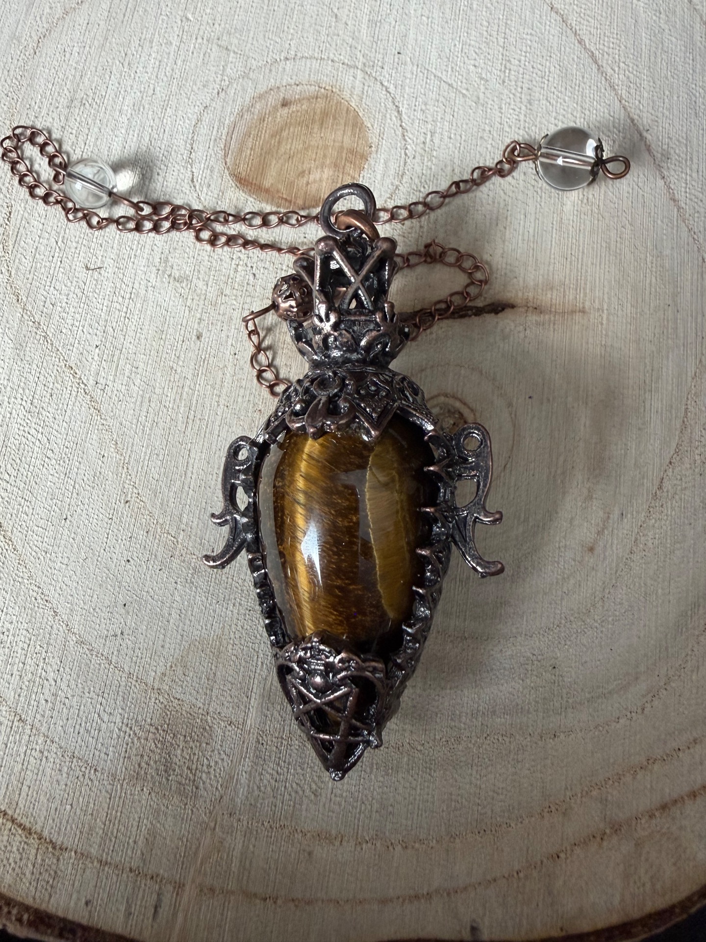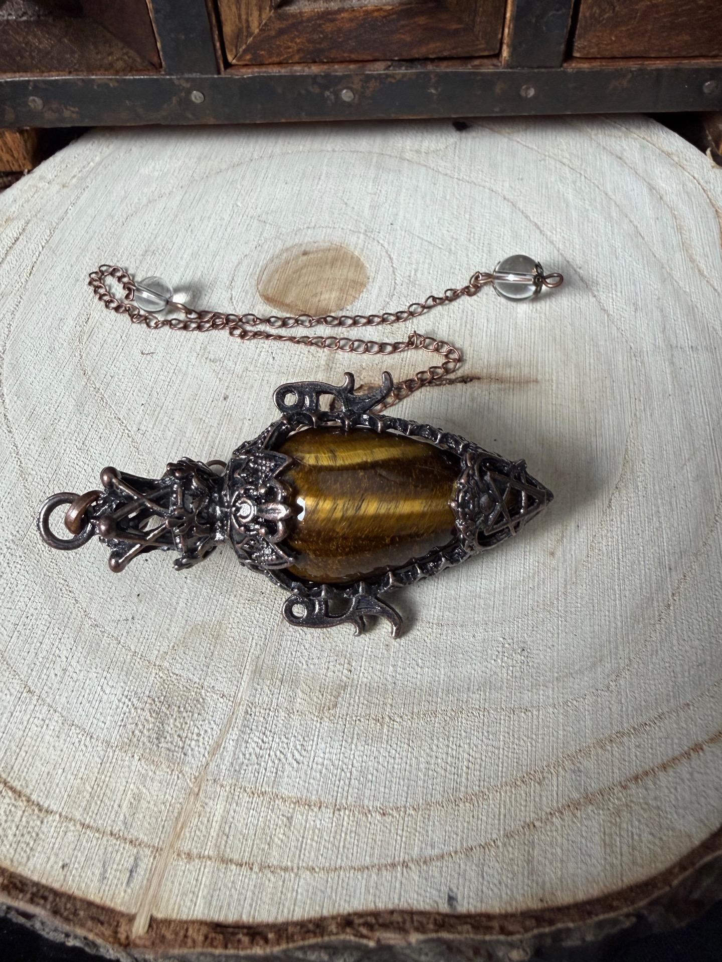 Magnifique Pendule en Oeil de Tigre goutte, entouré de sa magnifique cage couleur cuivre.